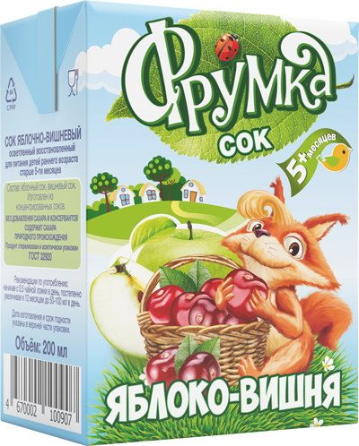 Фрумка Яблоко‑Вишня 0,2 л – осветлённый восстановленный сок без добавления сахара, изготовленный из концентрированных соков. Нежный яблочный вкус гармонично дополняется свежей кислинкой вишни. Продукт подходит для детей старше 6 месяцев, стерилизован и асептически упакован. Подавайте охлаждённым.