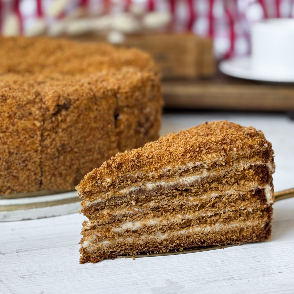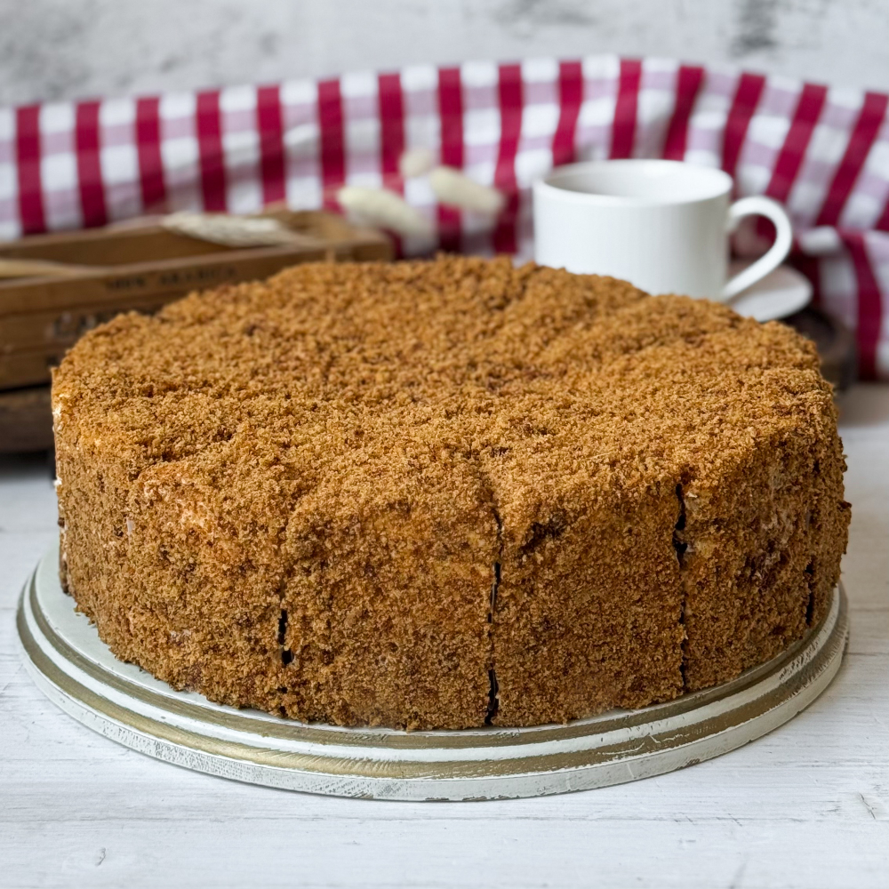 • Состав: мука пшеничная в/с; молоко коровье; молоко коровье сгущённое с сахаром варёное; сахар; меланж пастеризованный (яйцо куриное); маргарин (рафинированные дезодорированные растительные масла, вода, эмульгаторы: эфиры полиглицерина и жирных кислот, полиоксиэтиленсорбитан моноолеат, моно-и диглицериды жирных кислот; соль; консервант: сорбат калия; регулятор кислотности: лимонная кислота; ароматизатор, натуральный краситель: бета-каротин; антиокислитель: концентрат смеси токоферолов); мёд натуральный гречишный; крем для взбивания (вода, эквивалент масла какао, эмульгаторы: стеароиллактилат, гидроксипропилметилцеллюлоза, моно-ди-глицериды жирных кислот; регулятор кислотности: ортофосфат и цитрат натрия, эмульгатор: эфиры полиглицеридов и жирных кислот, целлюлоза; загуститель: желатин, гуаровая камедь; глютен, антиоксидант: кальциево-натриевая соль, аскорбилпальмитат; лактоза, декстроза, сорбитовый сироп, соль, эмульгатор: полиоксиэтилен сорбитан моностеарат, ароматизатор); желток яичный пастеризованный; сироп «крем-брюле» (сахар, вода, антиокислитель: лимонная кислота, консервант: бензоат натрия, натуральный ароматизатор «Вишня»); крахмал кукурузный; разрыхлитель: гидрокарбонатрия; концентрированный лимонный сок (лимонный сок, эфирное масло из кожуры лимона, антиоксидант: метабисульфит калия). Продукт содержит аллергены: глютен, молочный белок, яйцо. Может содержать следы соевого лецитина, арахиса и орехов.