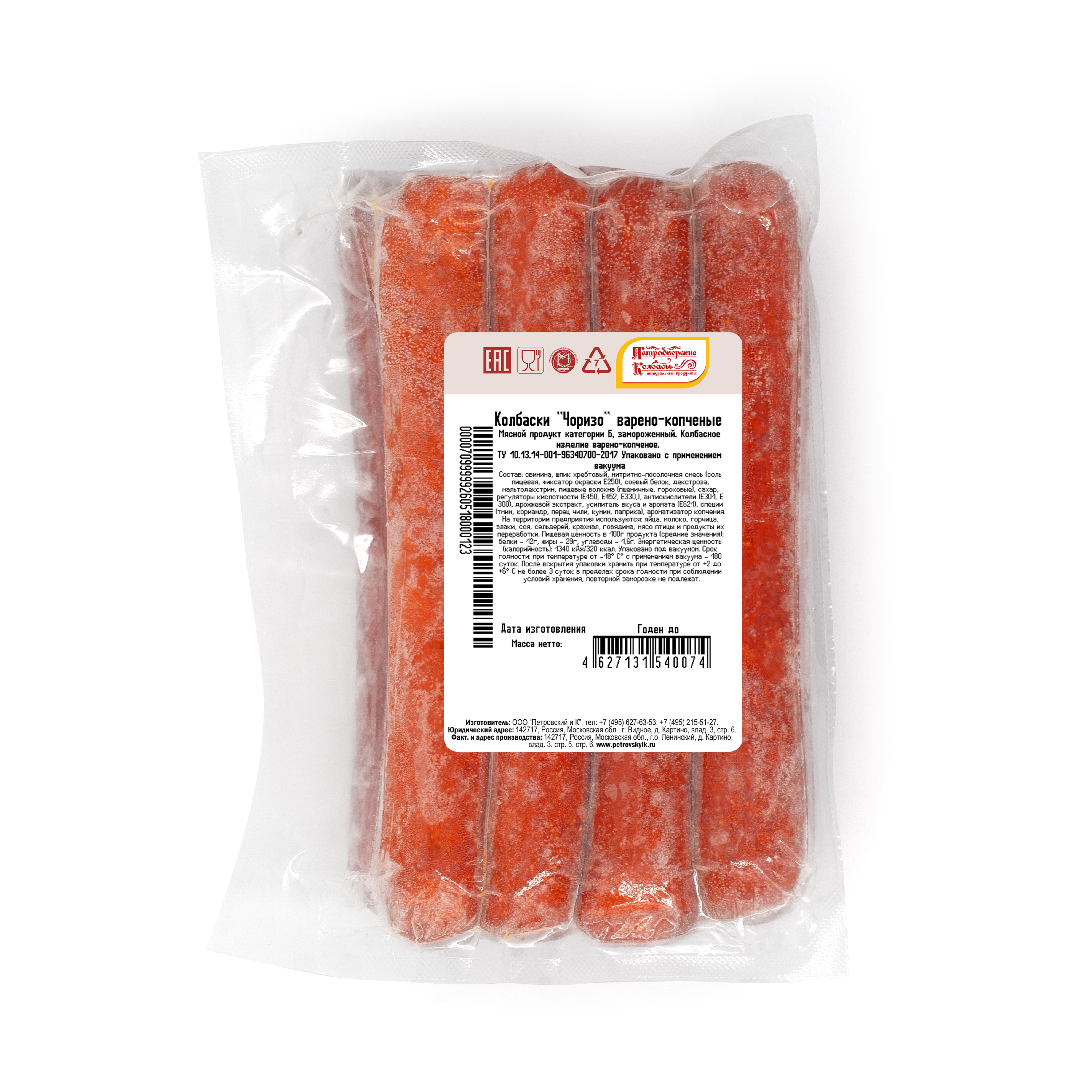 Колбаски «Чоризо» от Петродворских Колбас — замороженный мясной продукт категории Б, варено-копченое колбасное изделие, идеально подходящее для приготовления пикантных хот-догов. Произведены из свинины и шпика с добавлением специй, включая тмин, кориандр, перец чили, кумин и паприку, обеспечивающих яркий, острый вкус и аромат. Упакованы под вакуумом для сохранения свежести. Подходят для ресторанов, кафе и домашнего использования. Упаковка из 8 штук (в коробе 10 пачек) удобна для профессионального применения.