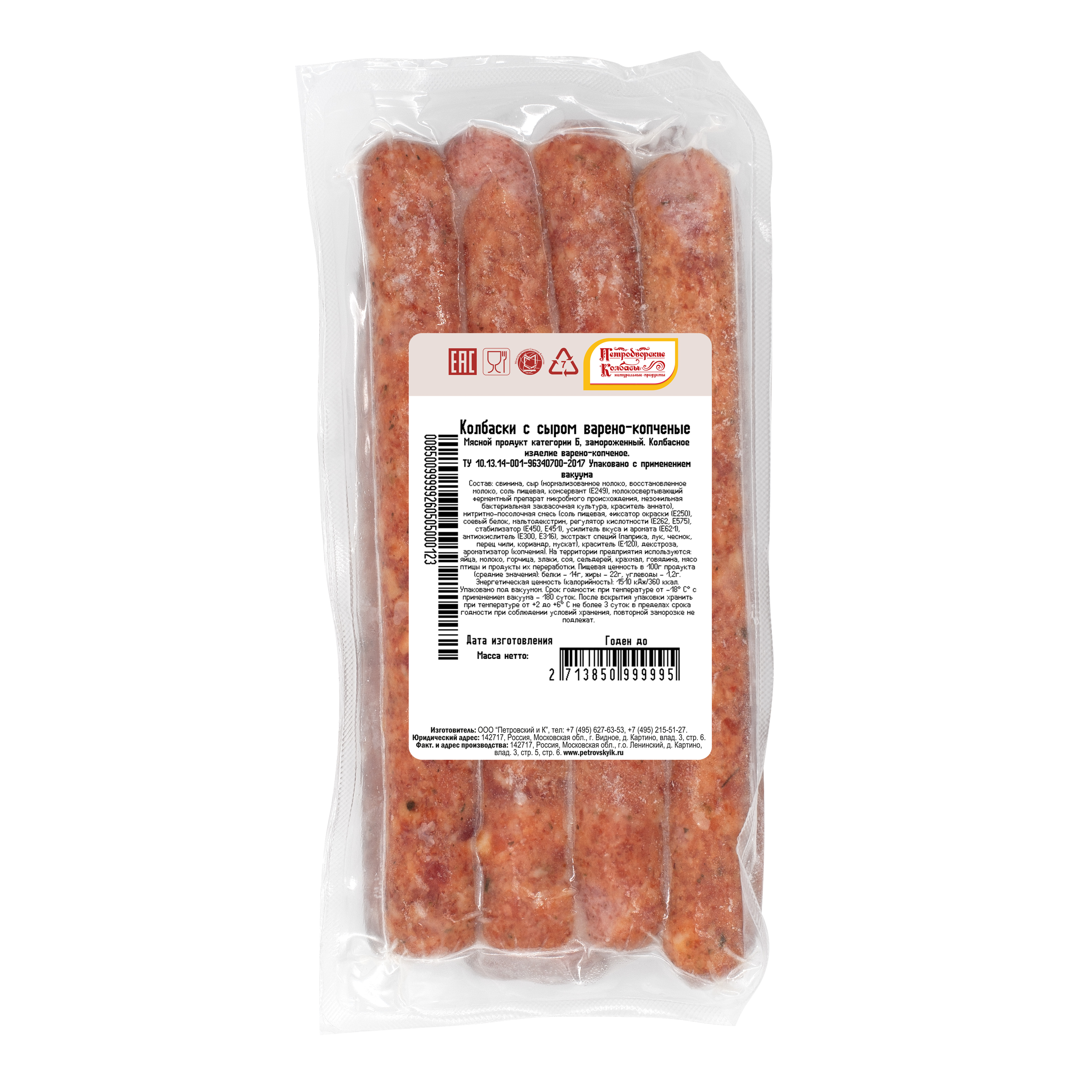 Колбаски «С сыром» от Петродворских Колбас — замороженный мясной продукт, варено-копченое колбасное изделие, идеально подходящее для приготовления аппетитных хот-догов. Произведены из свинины с добавлением сыра и специй, обеспечивающих насыщенный вкус и аромат. Упакованы в модифицированной атмосфере для сохранения свежести. Подходят для ресторанов, кафе и домашнего использования. Упаковка из 8 штук (в коробе 10 пачек) удобна для профессионального применения.