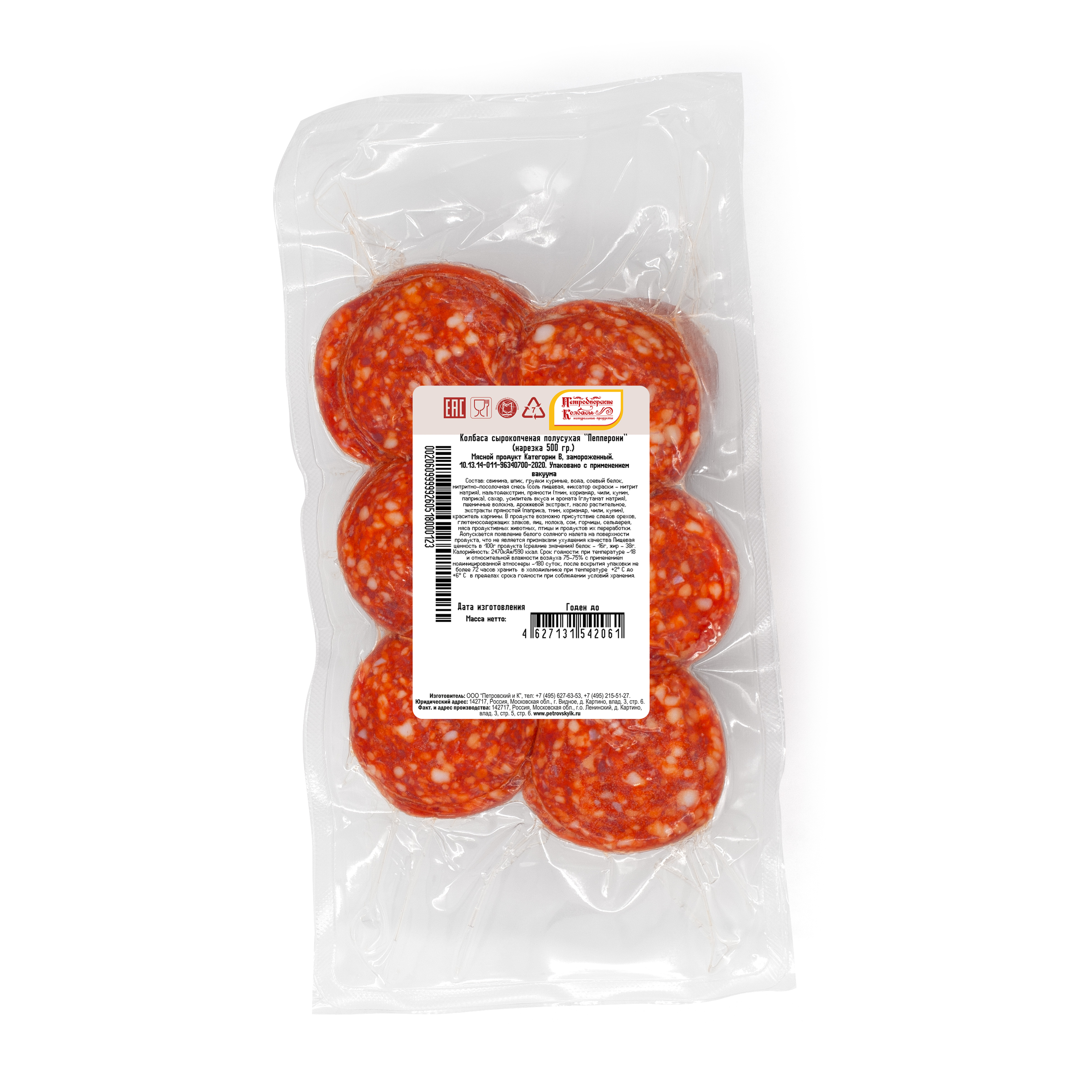 Колбаса нарезана слайсами, упакована в модифицированной газовой среде по 0,5 кг и заморожена для вашего удобства.