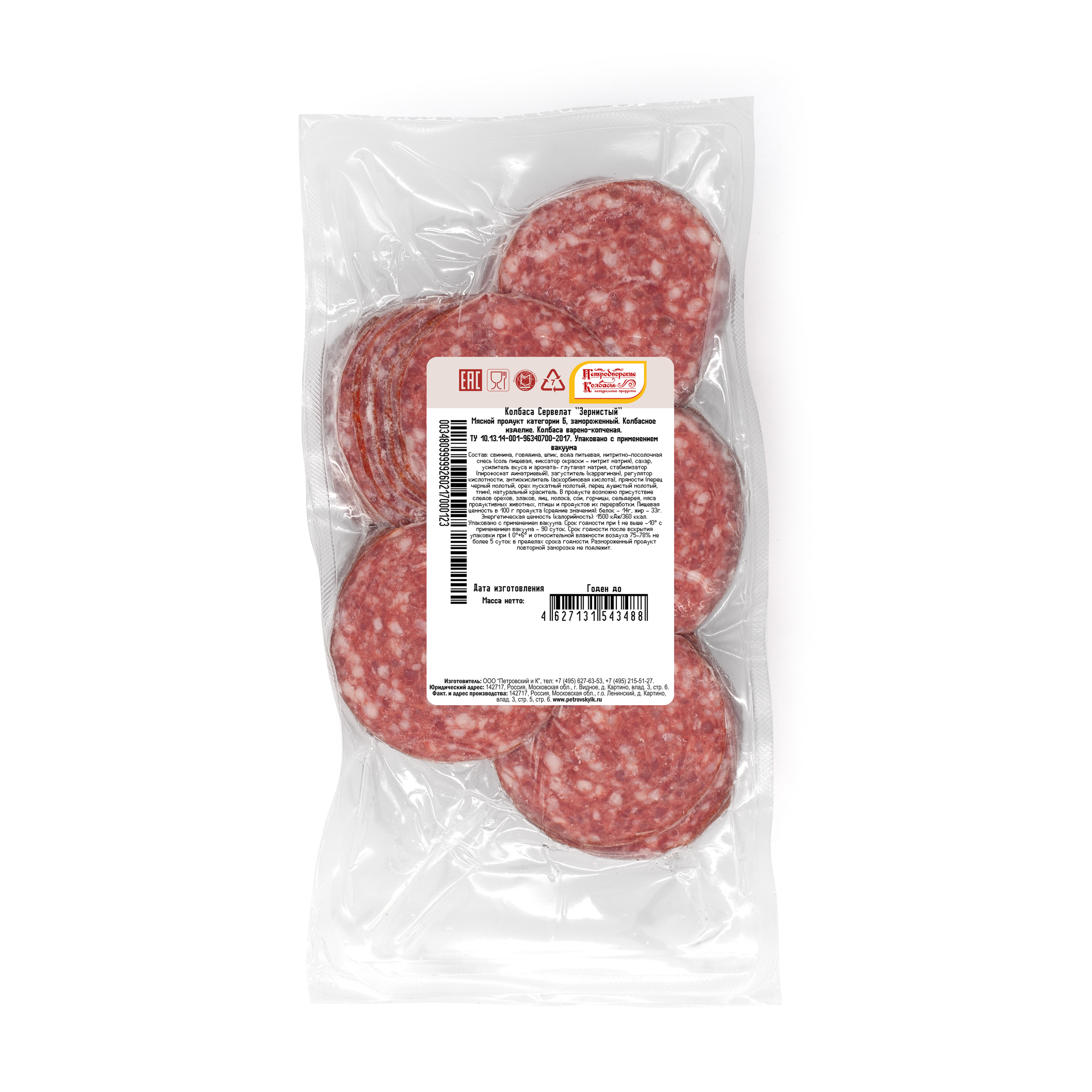 Колбаса Петродворские колбасы Сервелат Зернистый нарезка в/к в/у 500г