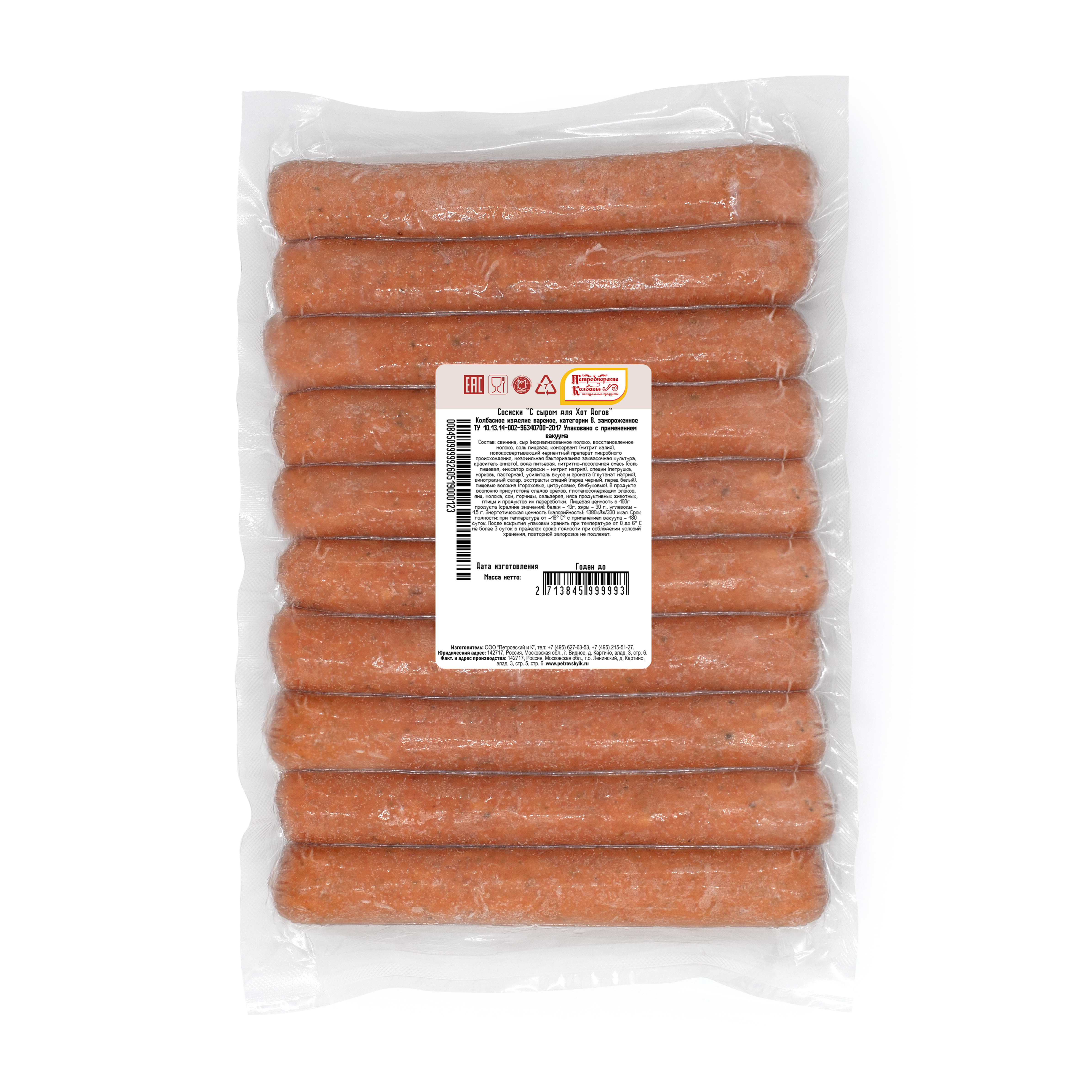Мясной продукт, изделие колбасное вареное. Сосиски «С сыром для Хот Догов», замороженные. ТУ 10.13.14-002-96340700-2017. Упаковано с применением модифицированной атмосферы.